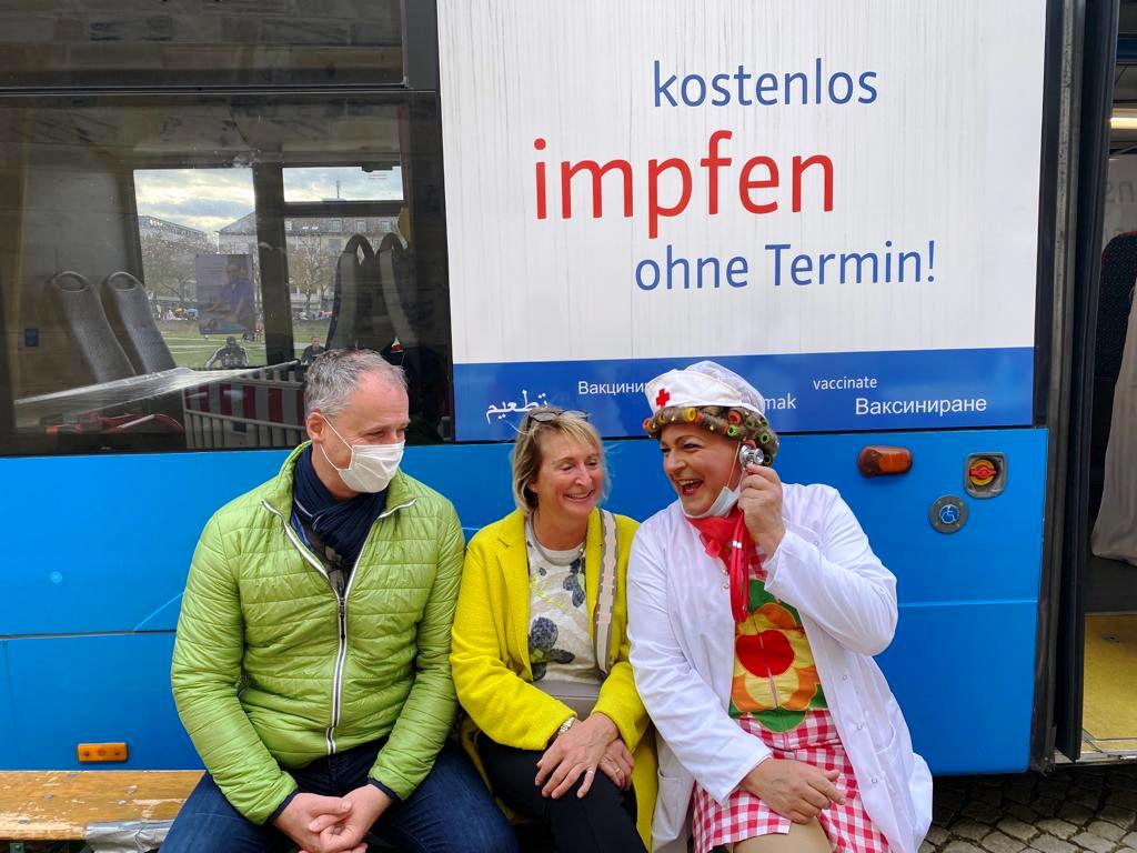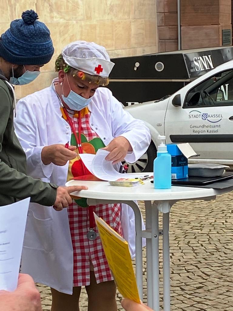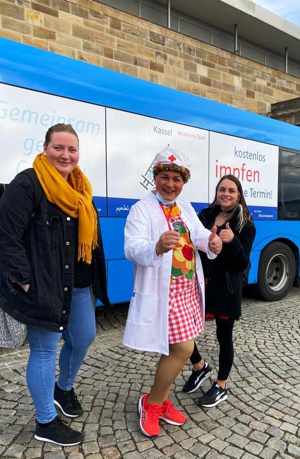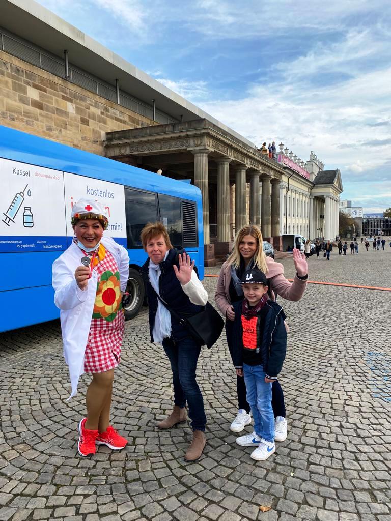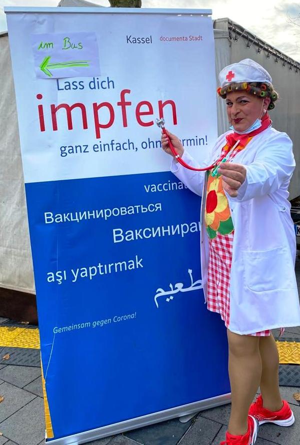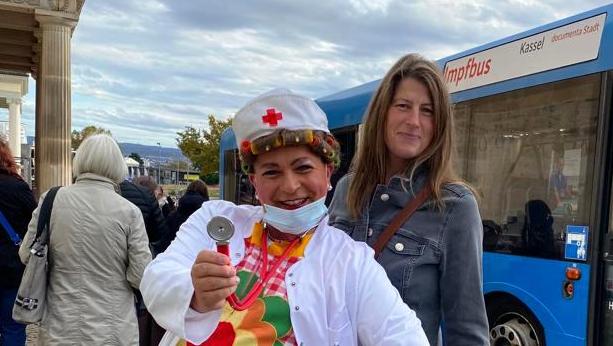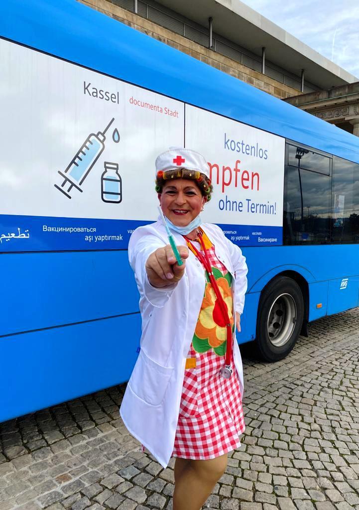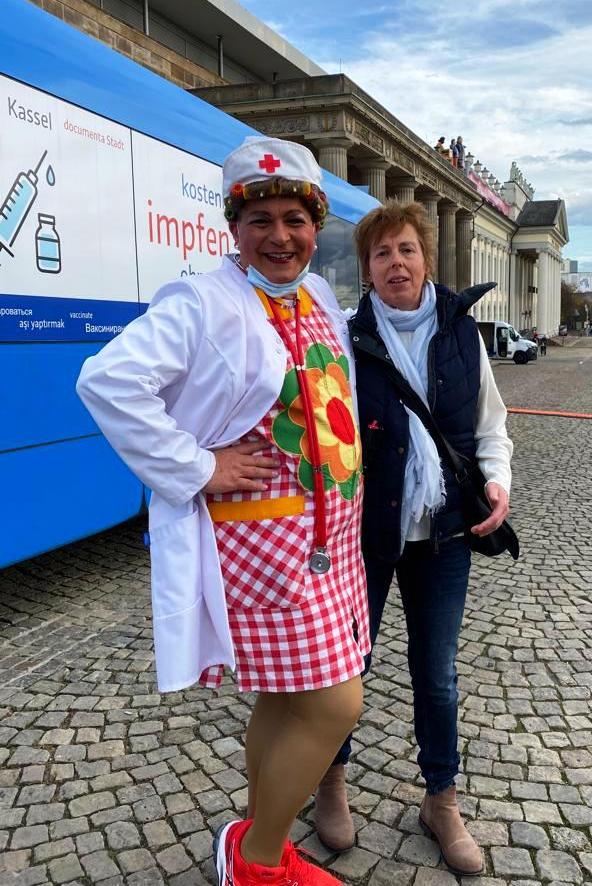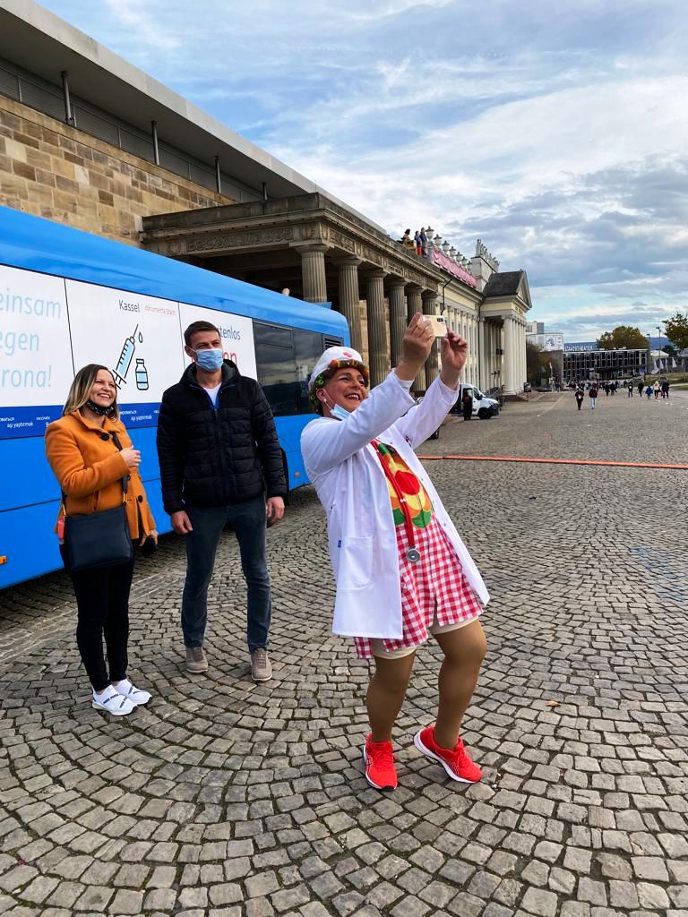 Wer sich impfen lässt, hat gut lachen: Schwester Lilli besuchte am Nachmittag den Impfbus auf der Casseler Herbst-Freyheit. Die Corona-Schutzimpfung als kostenlose Erst-, Zweit- und Drittimpfungen. Gute Laune vorm Impfbus dank Lilli - und im Impfbus dank Impfteam!